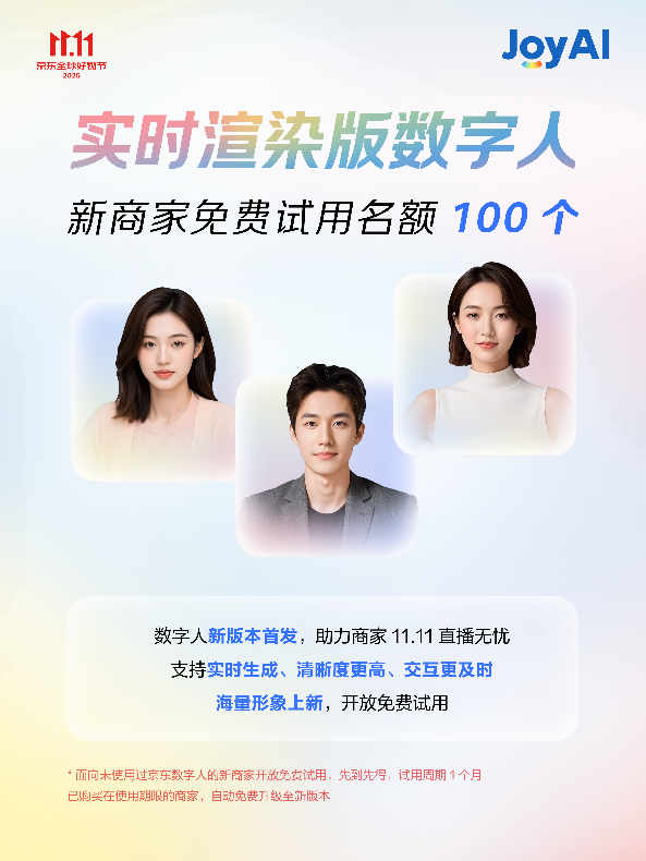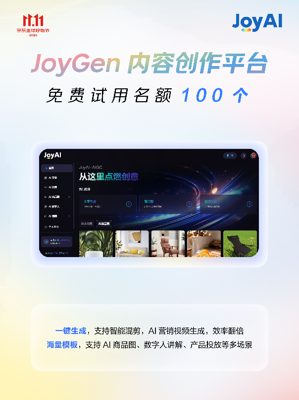 京东数字人团队担任人分享道。京东免费AI东西包促商家增加>500)this.width=500 align=center hspace=10 vspace=10 alt=大模子全面落地11.11,京东11.11期间,JoyGen内容创做平台供给100个免费账号,京东免费AI东西包促商家增加>