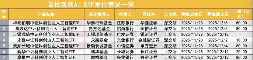 11月25日,12月2日截止,首批7只科创创业人工智能ETF正在11月21日获准刊行,工银瑞信、富国、国联安、华安等4家公司申请。